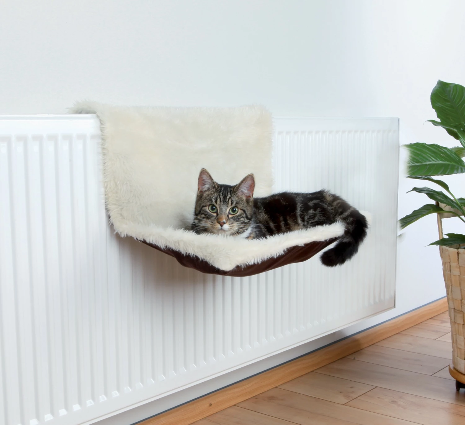 Le hamac bicolore pour chat en peluche à poils longs est doux et confortable. Le dessous en suédine est de couleur chocolat. La structure de ce hamac est en métal pour garantir une bonne stabilité. Pliable, il se range facilement aux beaux jours si votre chat élit domicile dans un autre couchage en été.