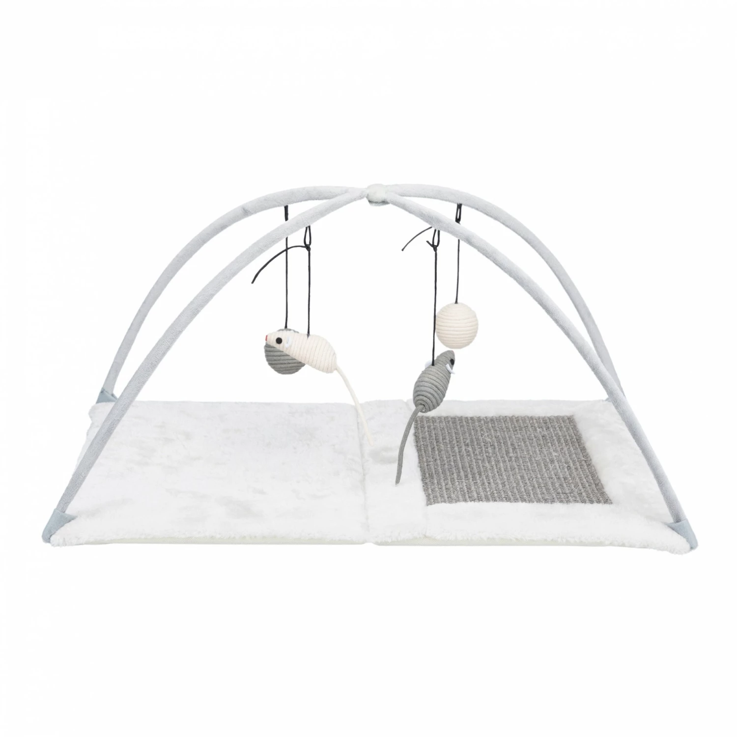 Il est composĂ© d’un Ă©pais tapis bi-matière surmontĂ© d’arceaux desquels pendent quatre jolis jouets : deux balles et deux souris.