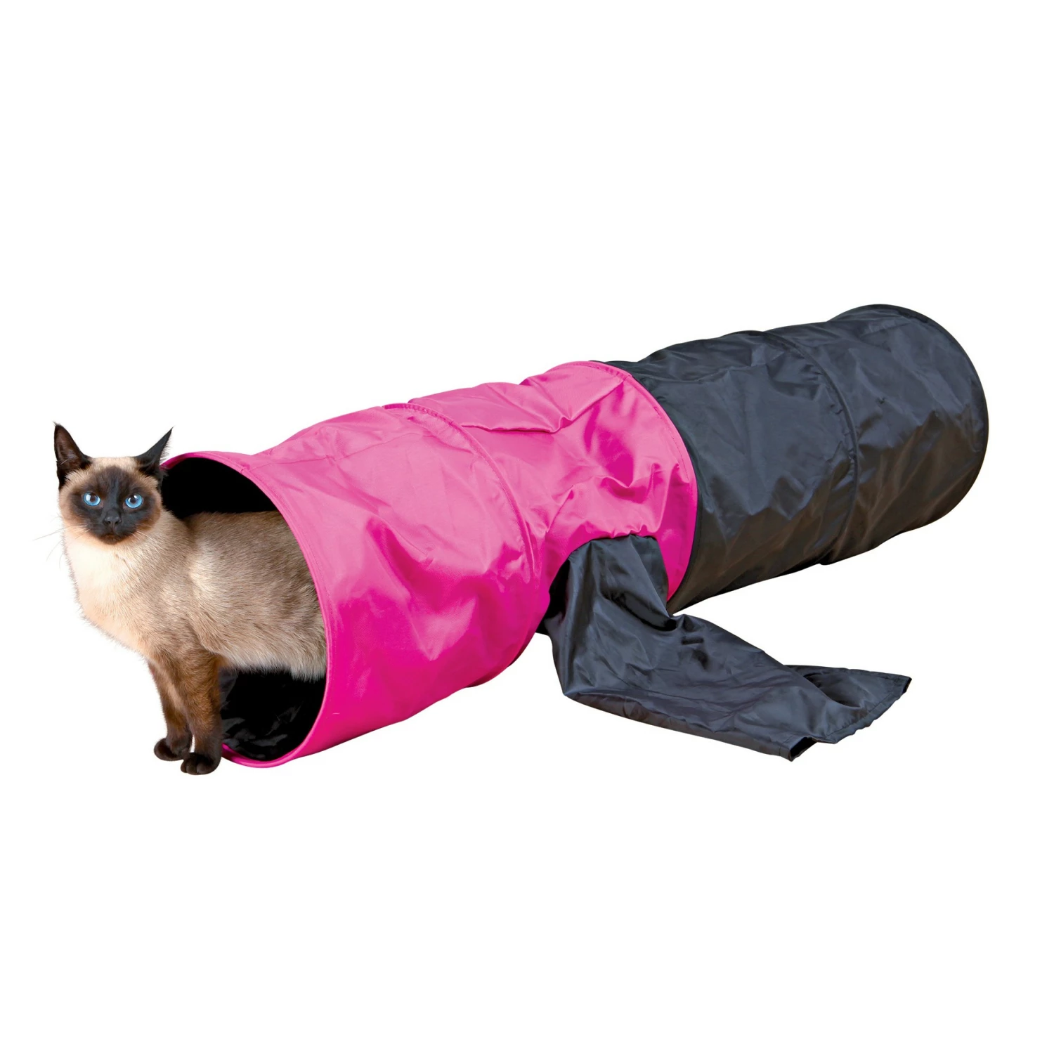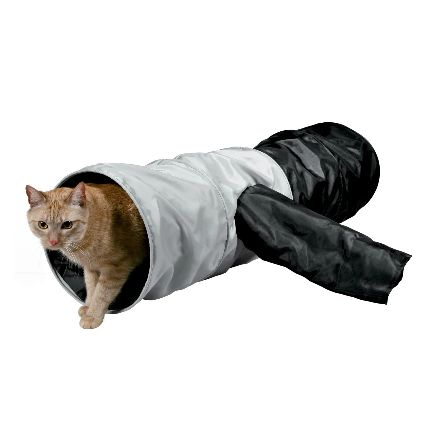 En polyester, le tissu est composé de papier froissé, ce qui provoque un bruit craquant pour inciter le chat à jouer. Il dispose de 4 entrées : aux extrémités, au centre du tunnel principal et la 4ème entrée sur le petit tunnel secondaire.