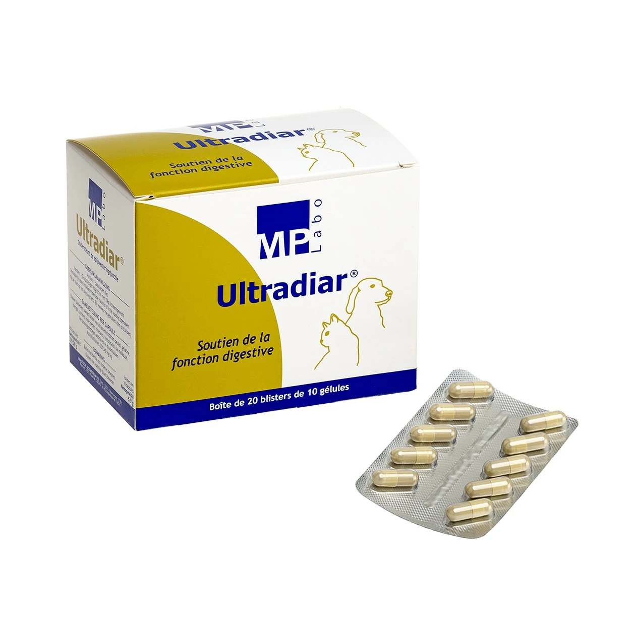 Ultradiar a une double action chez le chien et le chat : soutien de la fonction digestive et maintien de l’équilibre naturel de la flore intestinale. Pour en savoir plus, consultez la rubrique « Autres informations ».