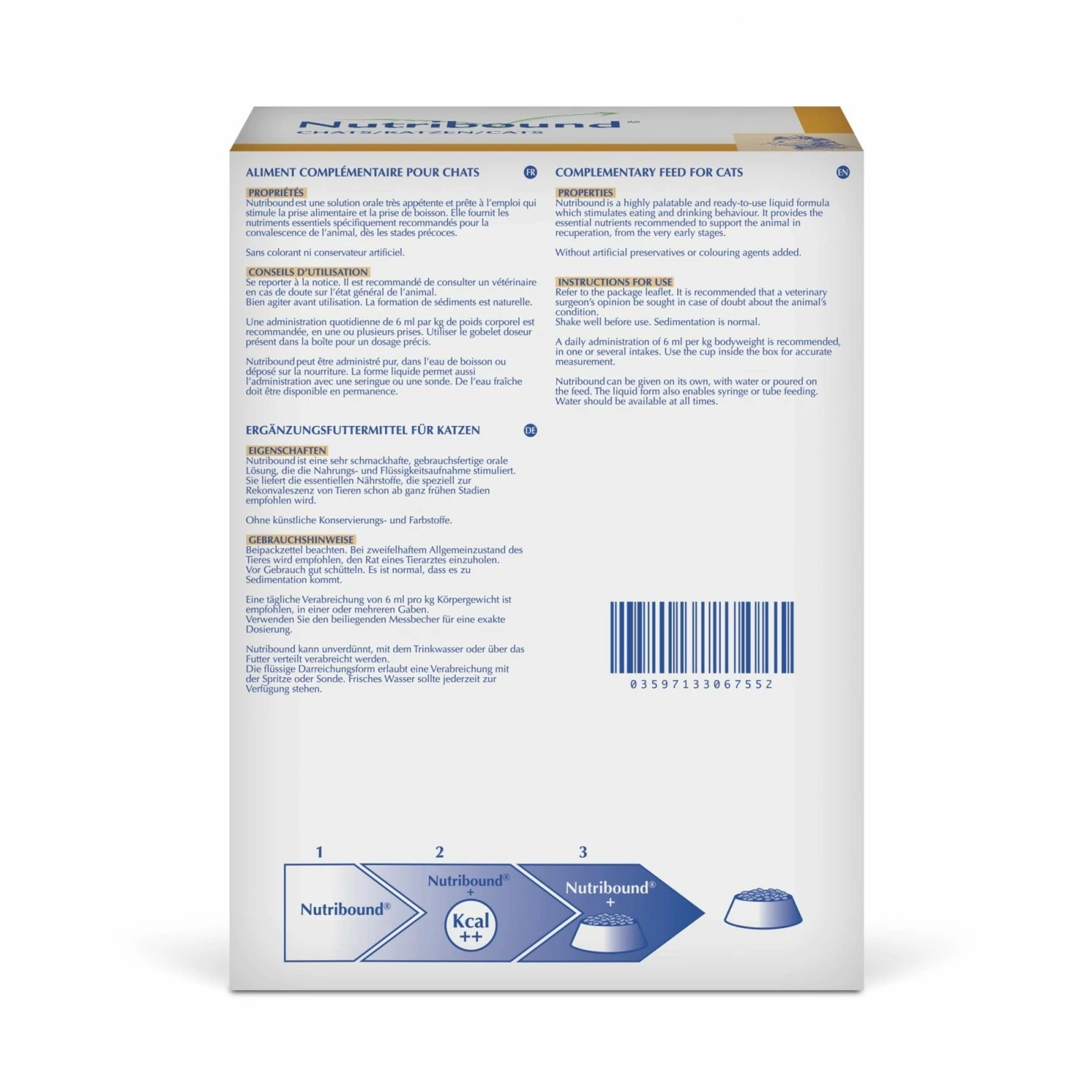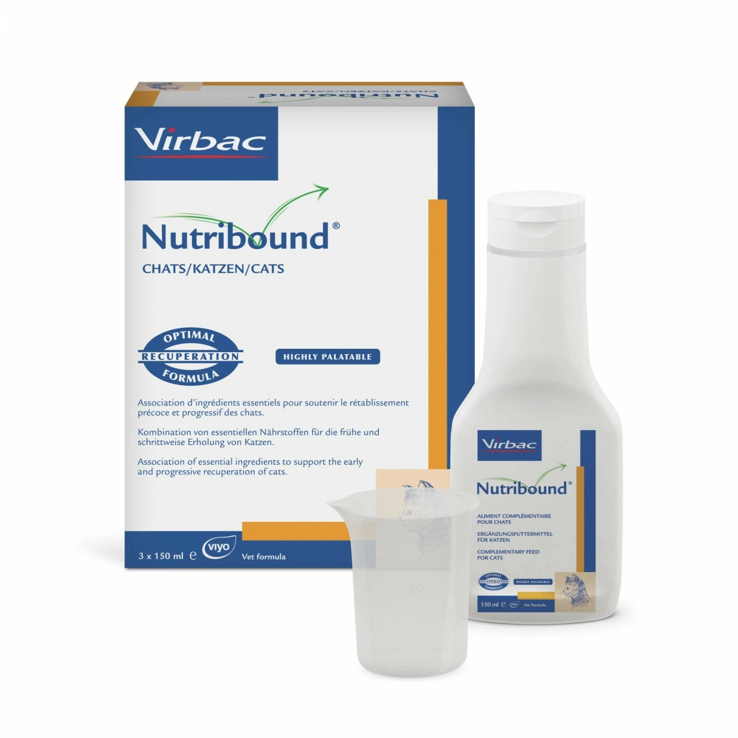 Nutribound® Chats est une solution orale très appĂ©tente et prĂŞte Ă l’emploi qui stimule la prise alimentaire et la prise de boisson chez le chat malade ou convalescent jusqu’Ă la reprise de l’alimentation habituelle.