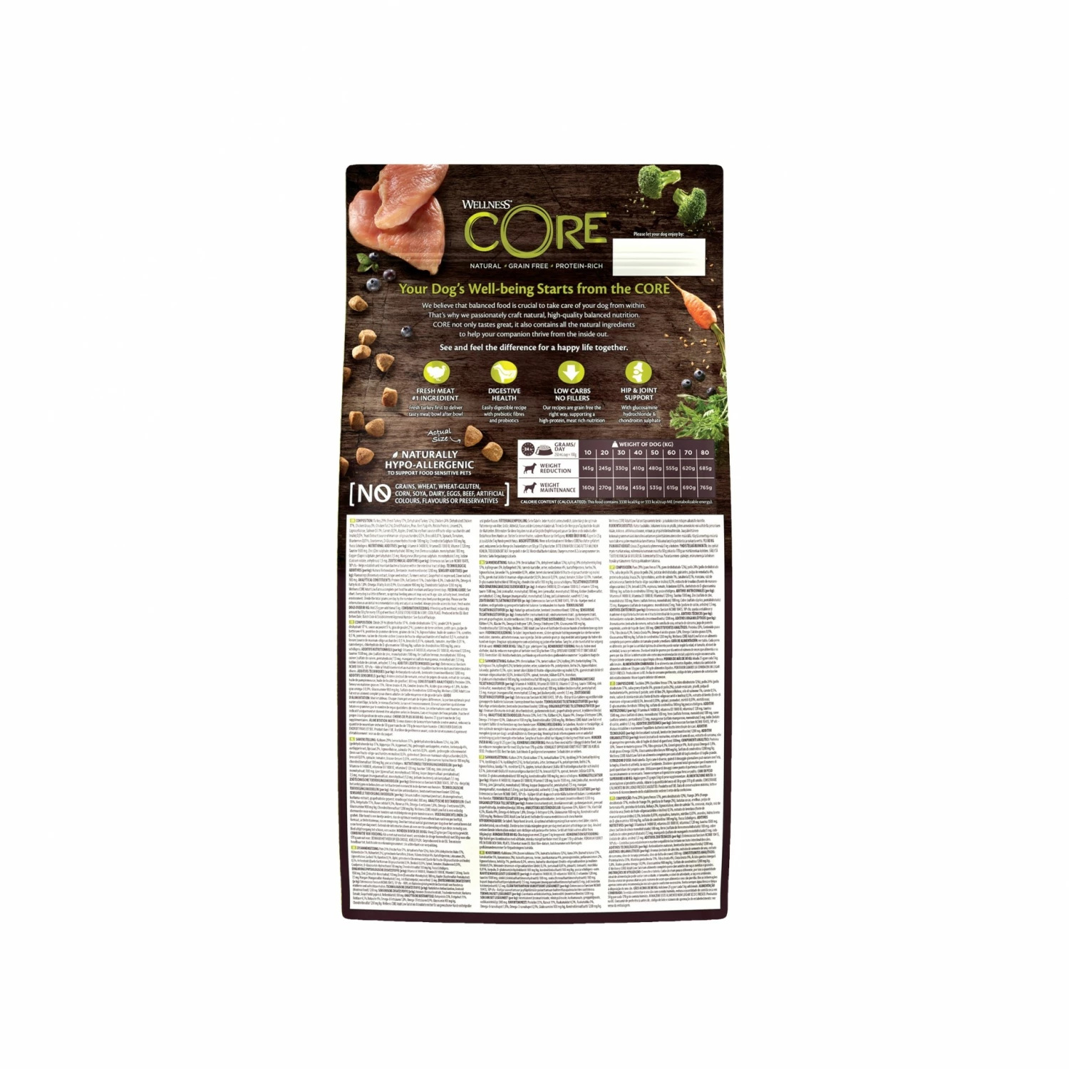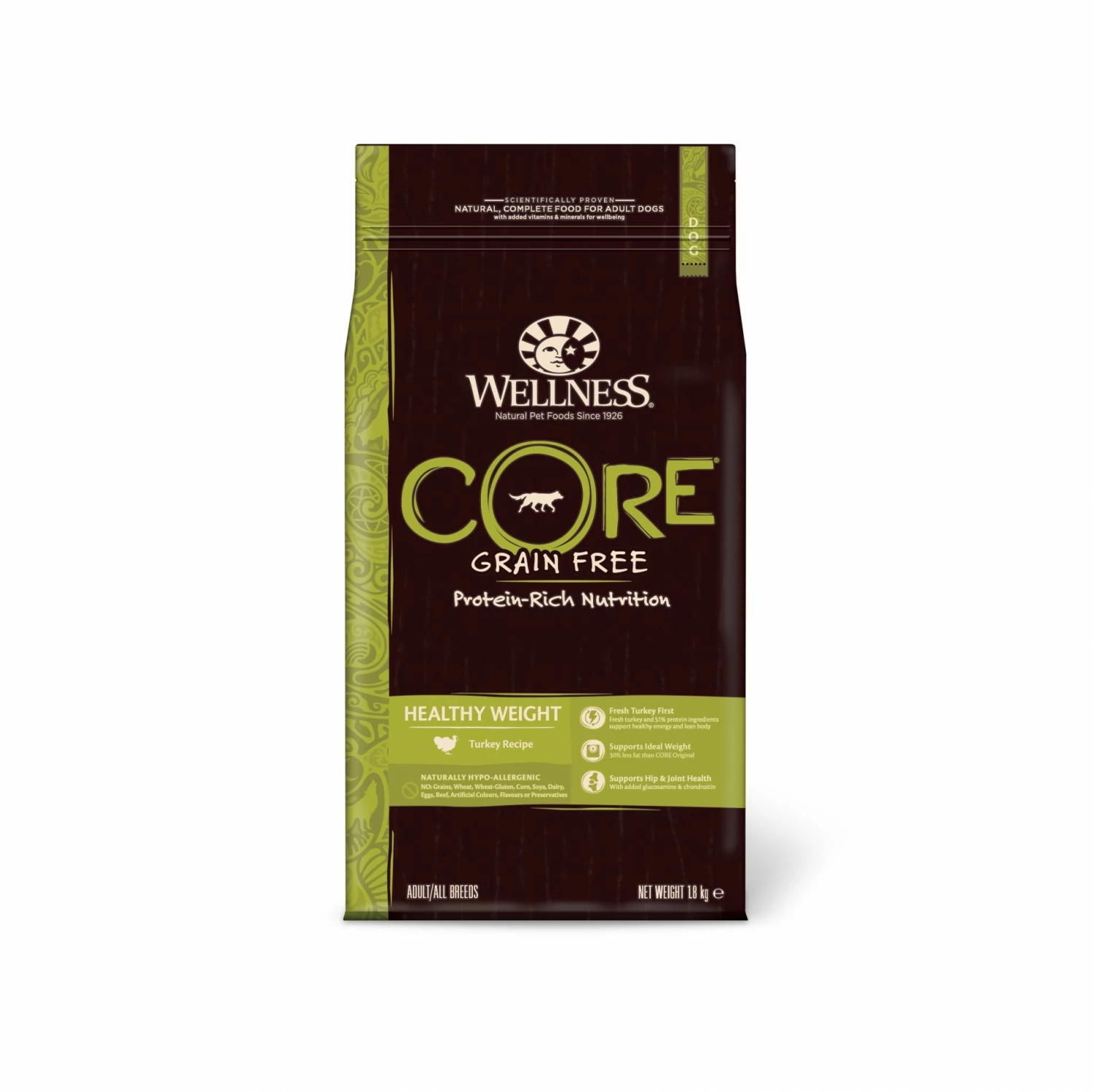 Les croquettes Wellness CORE Healthy Weight Dinde contiennent de la dinde fraîche en premier ingrédient. Elles sont allégées (teneur réduite en matières grasses) pour aider les chiens à maintenir leur poids idéal. Elles contiennent également de la chondroïtine et de la glucosamine qui soutiennent le fonctionnement des articulations.
