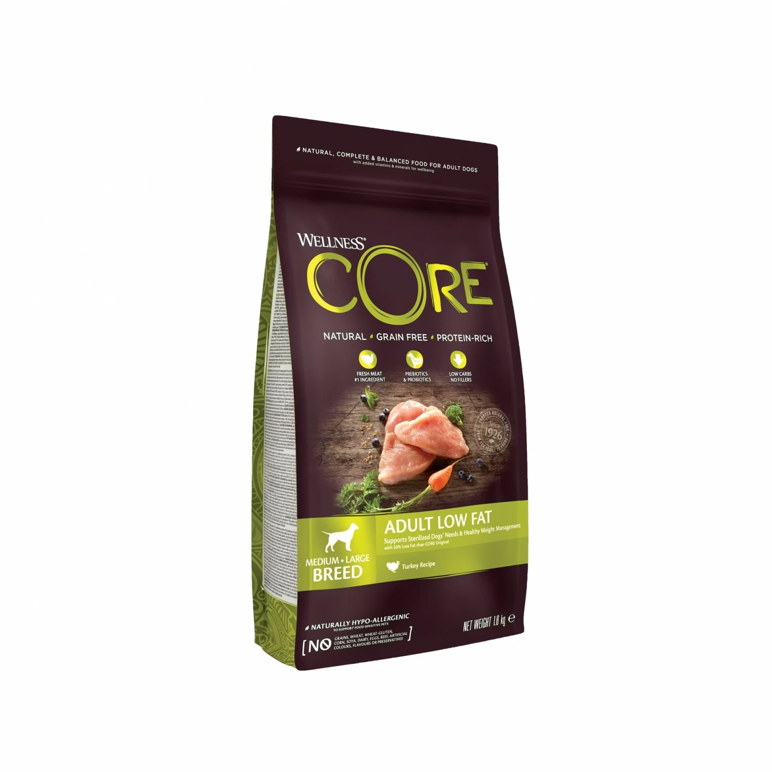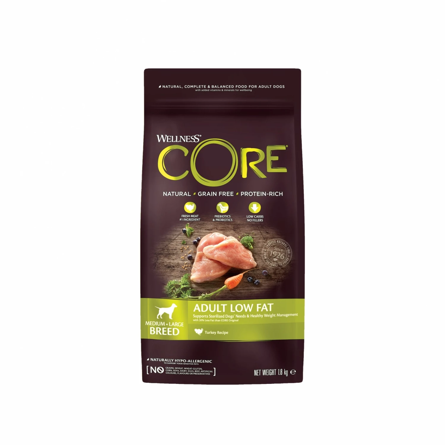 Les croquettes Wellness CORE Healthy Weight Dinde sont spécialement conçues pour les chiens adultes stérilisés ou ayant tendance à prendre du poids. Leur composition se rapproche du régime alimentaire naturel des chiens : elles sont sans céréales, riches en protéines et elles contiennent de la viande fraîche. Elles sont sans colorants, arômes et conservateurs artificiels.