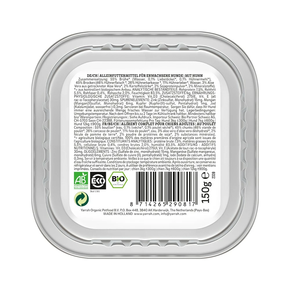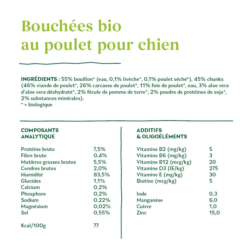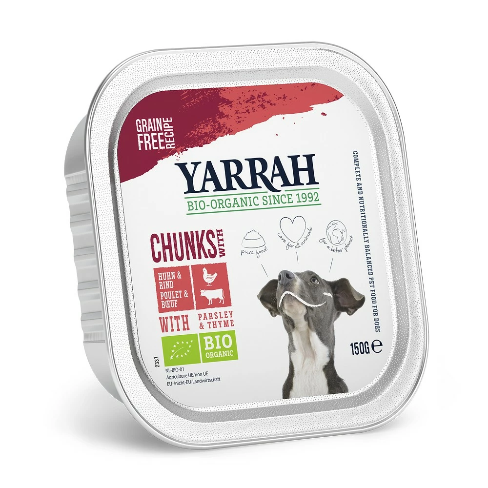 Les bouchées biologiques Yarrah sont de délicieux morceaux de viande et/ou de légumes dans une sauce, elles constituent un repas savoureux et moelleux. Cette nourriture humide est bio et très saine pour votre chien !