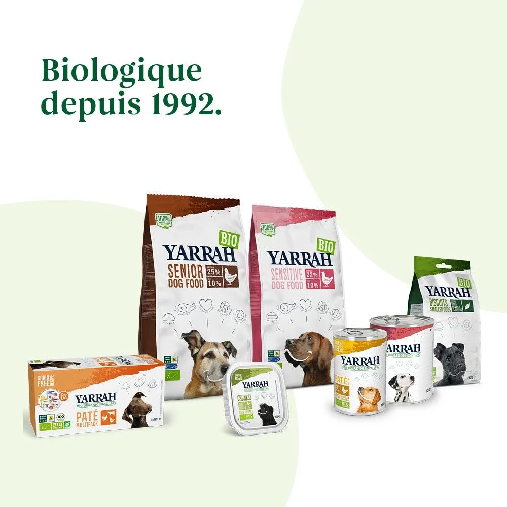 Les croquettes Yarrah pour chiens Senior sont biologiques et conviennent à tout type de chiens de plus de 7 ans. Elles constituent un repas complet, sain et équilibré source de protéines !